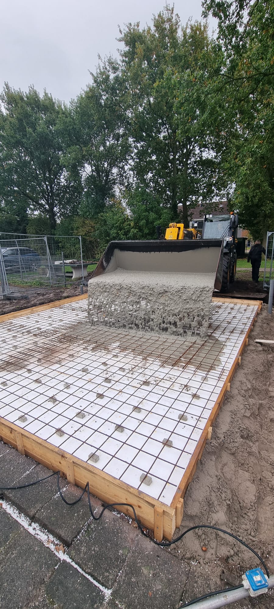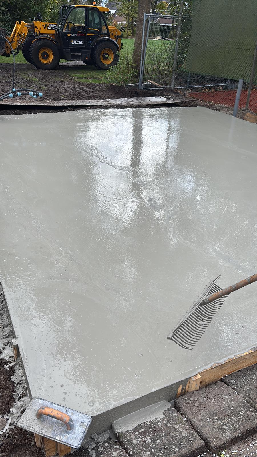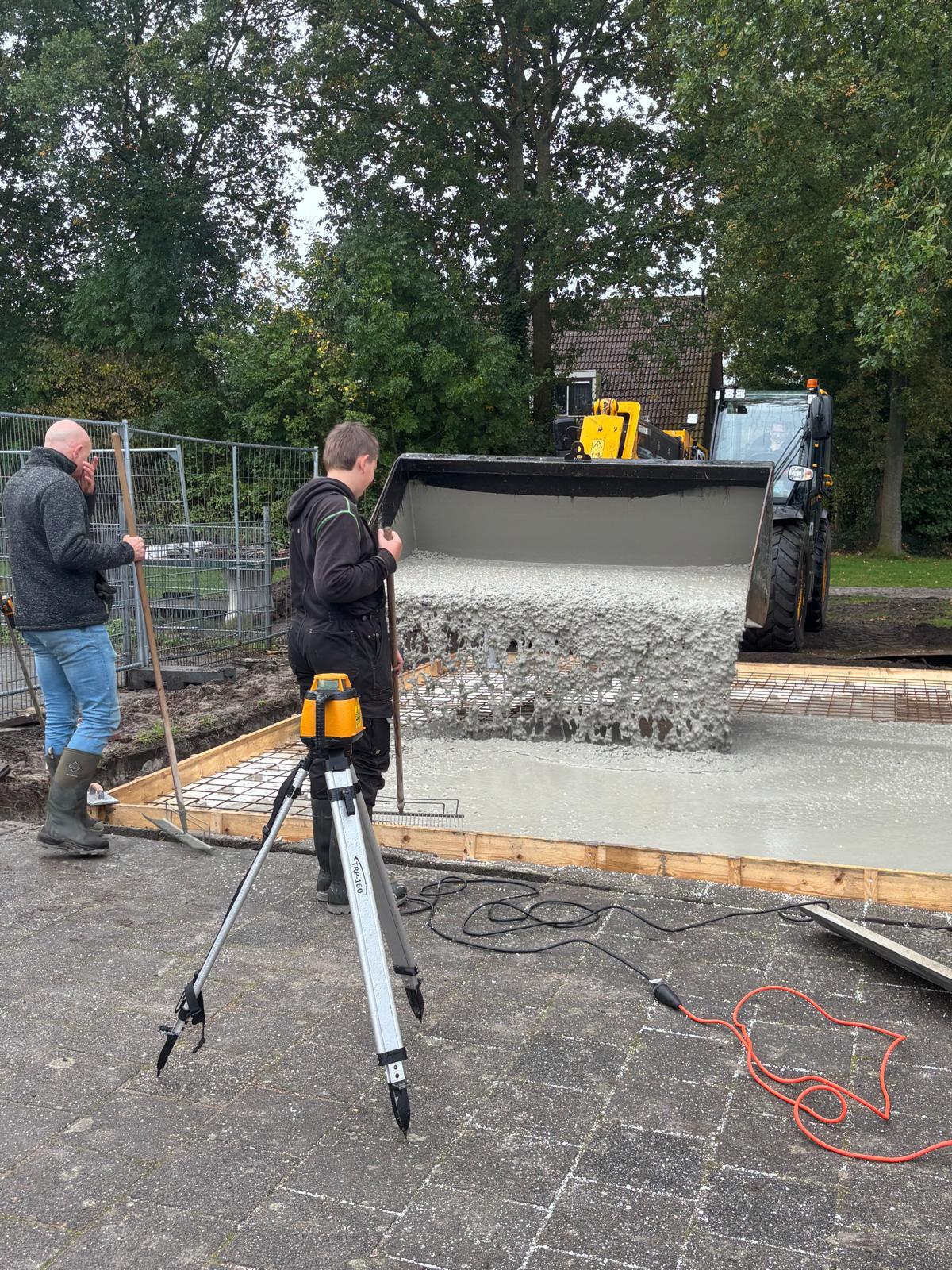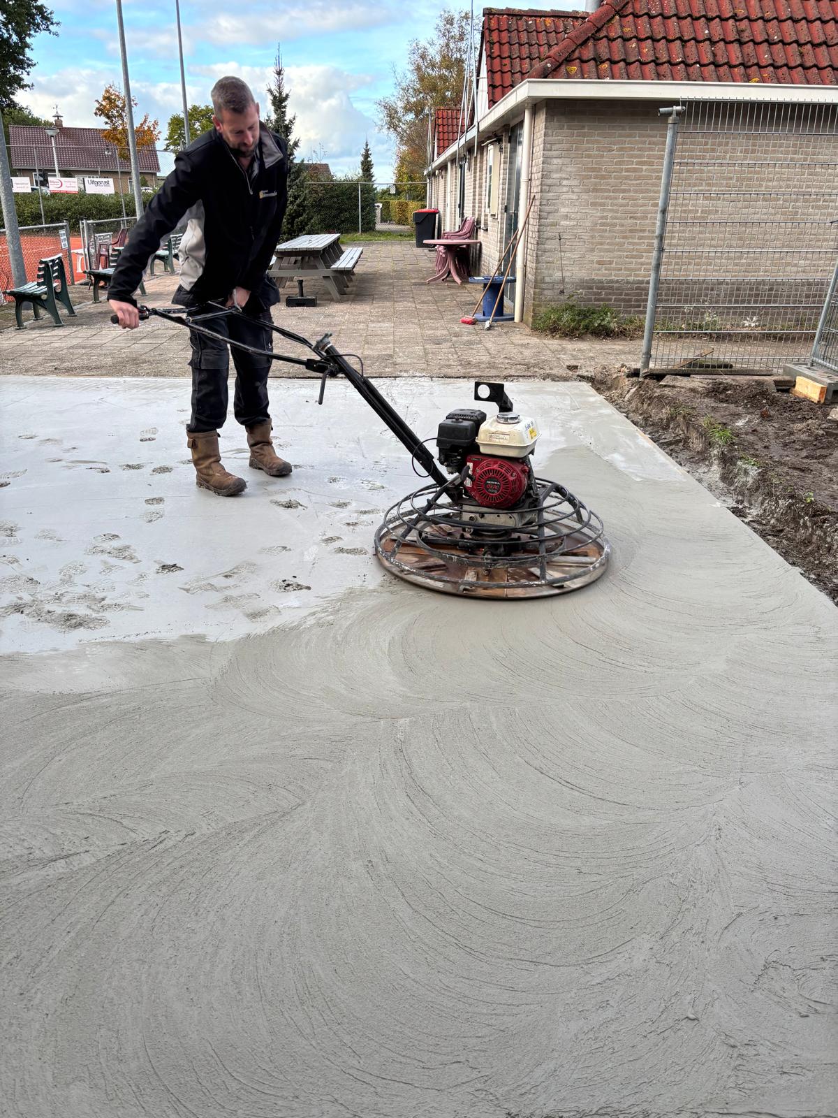 Vrijdag 17 oktober is de vloer gestort van ons clubhuis. Met een verrijker is het beton via het schelpen paadje naar de tennisbaan gebracht, waarna het vlak geschoven is. Nadat het een beetje ingedroogd was is er begonnen met het beton glad, verdicht en slijtvast te maken.