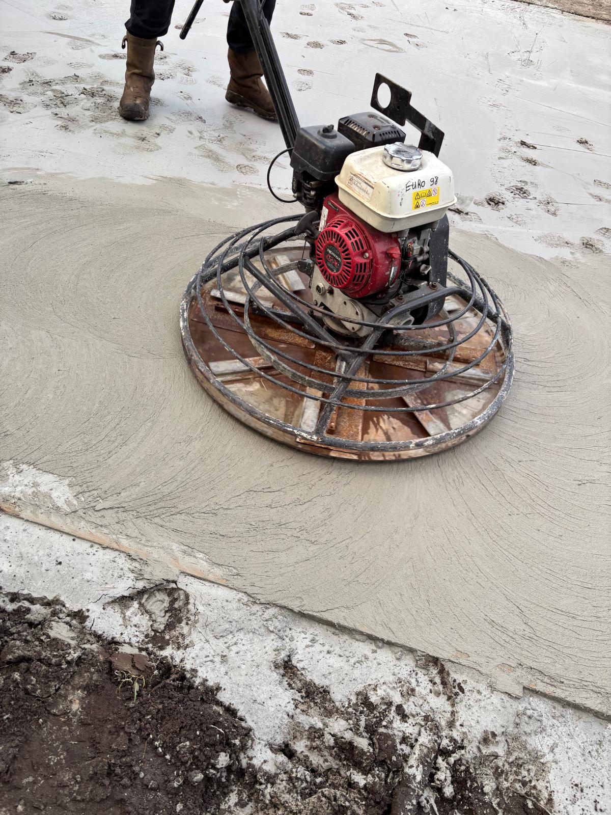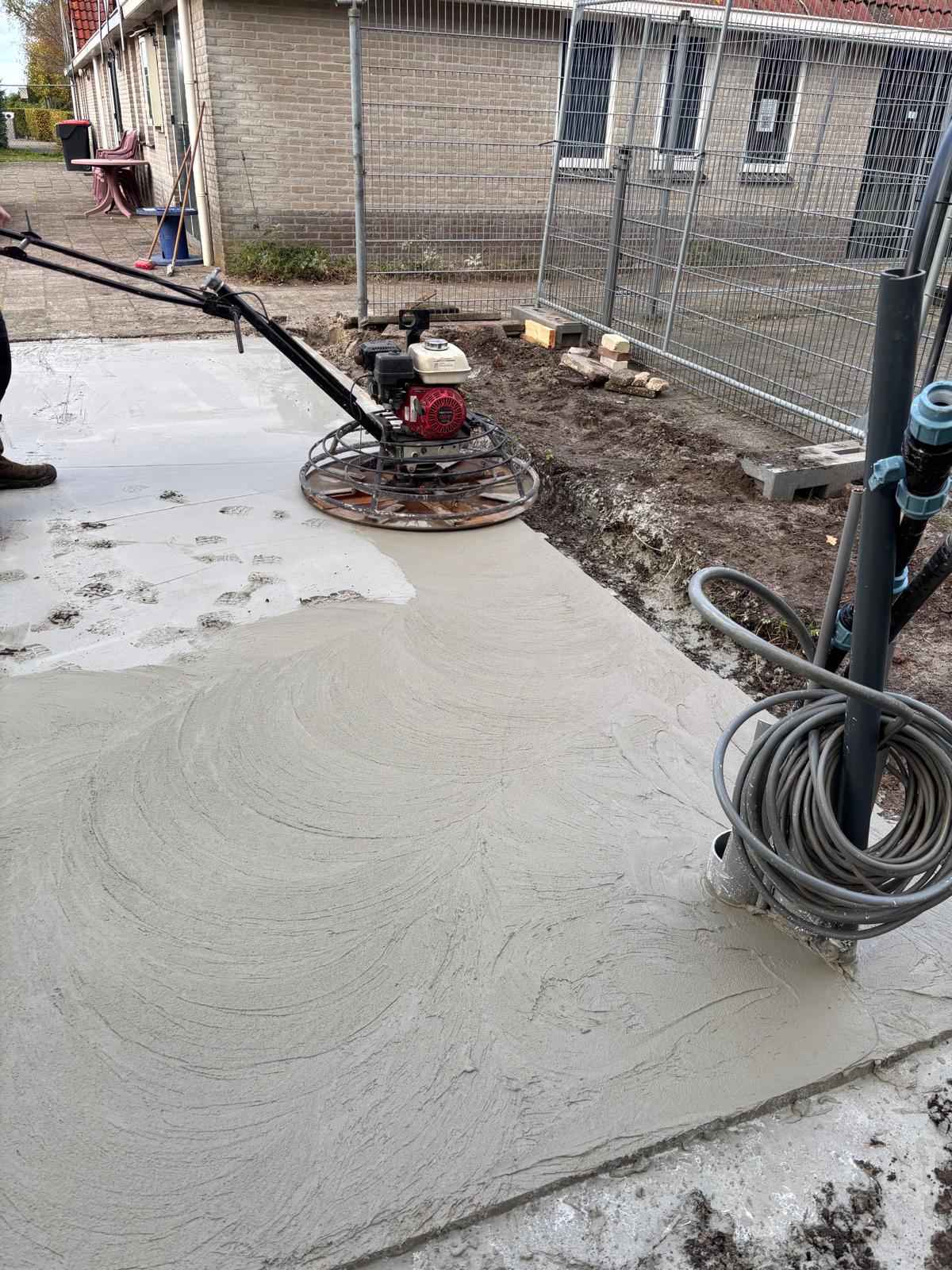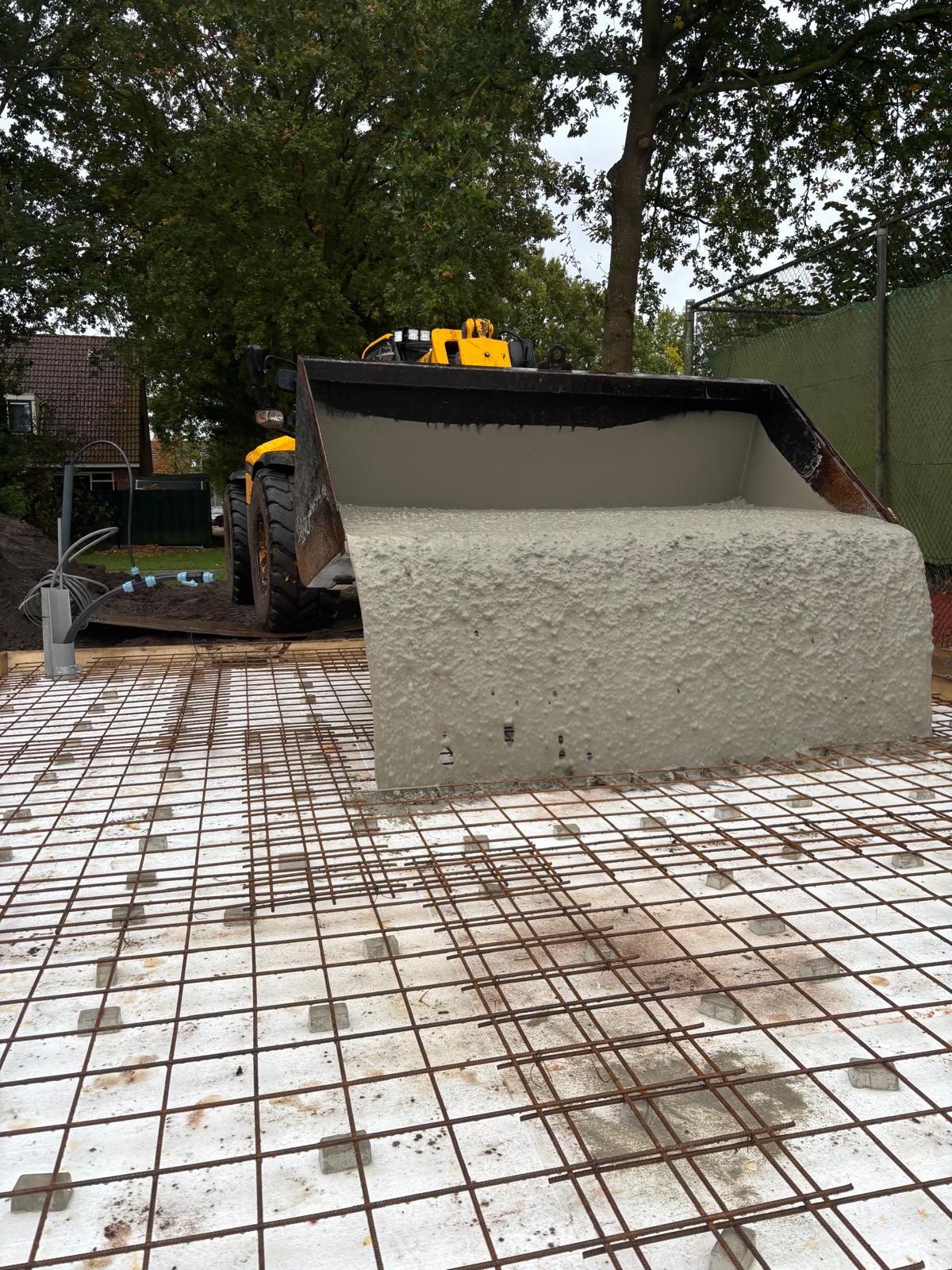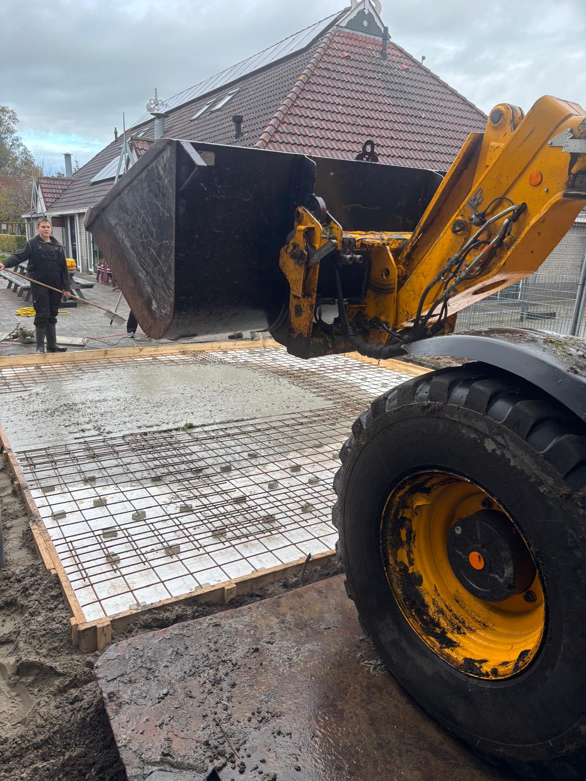 Vrijdag 17 oktober is de vloer gestort van ons clubhuis. Met een verrijker is het beton via het schelpen paadje naar de tennisbaan gebracht, waarna het vlak geschoven is. Nadat het een beetje ingedroogd was is er begonnen met het beton glad, verdicht en slijtvast te maken.